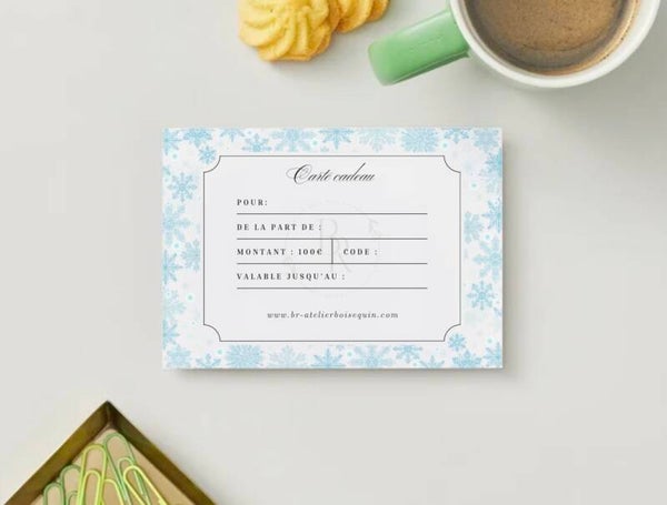 Carte cadeau édition "Hiver 2025", imprimée et envoyée en enveloppe prête à offrir.