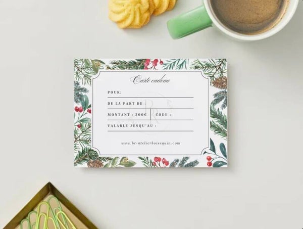 Carte cadeau édition "Hiver 2025", imprimée et envoyée en enveloppe prête à offrir.