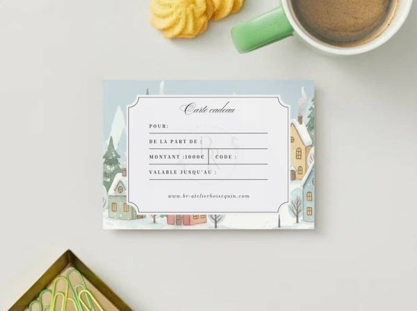 Carte cadeau édition "Hiver 2025", imprimée et envoyée en enveloppe prête à offrir.